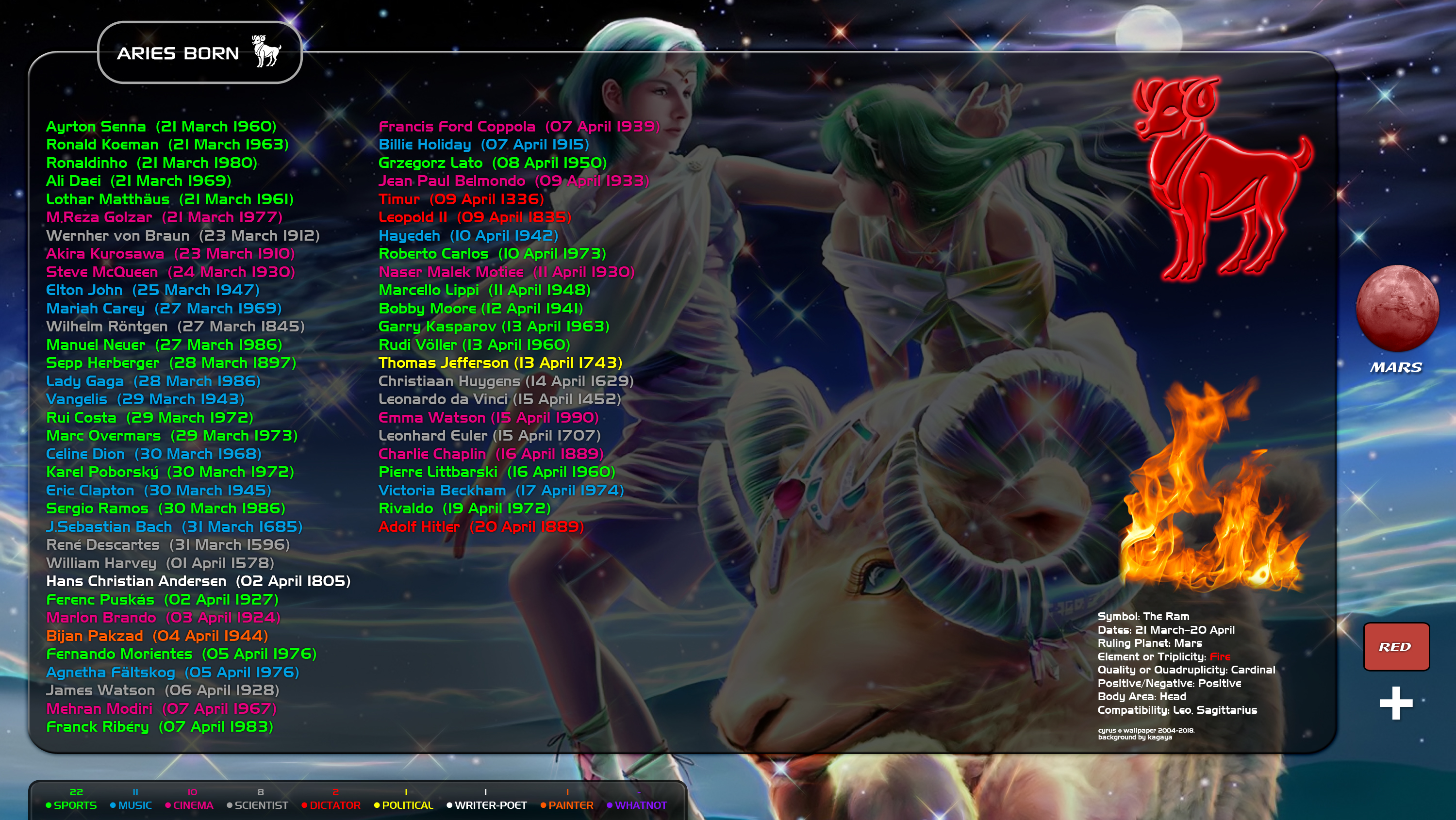 معرفی شخصیت های معروف و بزرگ جهان که متولد علامت فلکی Aries (حمل) هستند و نیز جهت پیدا کردن هم تولد خود. عنصر این ماه آتش و سیاره آن مریخ می باشد. اگر شما هم متولد Aries هستید بهتر است با شخصیت های معروف و بزرگ جهان این ماه آشنا شوید. همینطور می توانید هم تولد خود را در این بین پیدا کنید. در این والپیپر تلاش شده تا از معروفترین شخصیت ها در زمینه خودشان استفاده شود. همچنین هر حرفه با یک رنگ مشخص شده تا کاربران راحت تر شخصت های ماه خود را پیدا کنند. از معروفترین شخصیت های متولد این ماه می توان از Charlie Chaplin هنرپیشه کمدی بزرگ سینمای جهان, Ferenc Puskas فوتبالیست معروف مجاری, Leonardo Da Vinci طراح-دانشمند-نقاش-مخترع تاریخ و Adolf Hitler به عنوان دیکتاتور بزرگ قرن 20 نام برد.