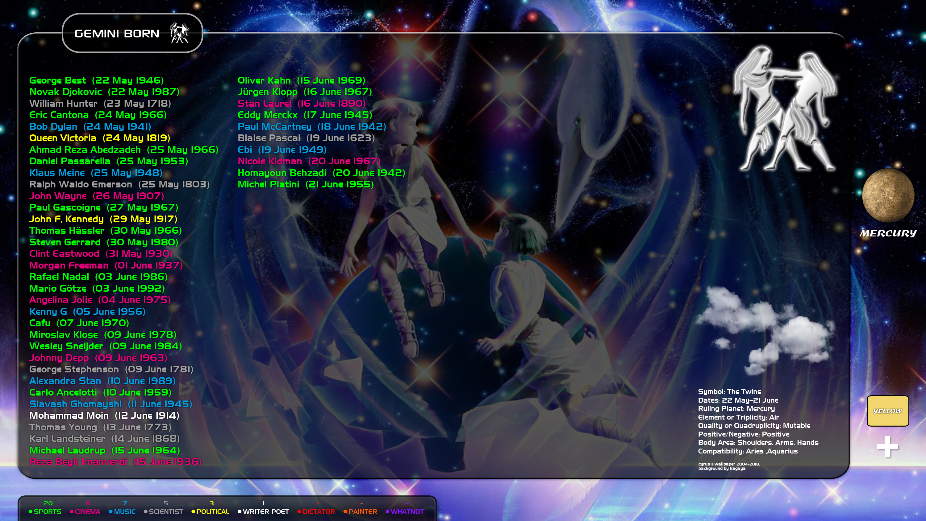معرفی شخصیت های معروف جهان که متولد علامت فلکی Gemini (جوزا) هستند و نیز جهت پیدا کردن هم تولد خود. عنصر این ماه هوا, سیاره آن عطارد می باشد. اگر شما هم متولد Gemini هستید بهتر است با شخصیت های معروف و بزرگ جهان این ماه آشنا شوید. همینطور می توانید هم تولد خود را در این بین پیدا کنید. در این والپیپر تلاش شده تا از معروفترین شخصیت ها در زمینه خودشان استفاده شود. همچنین هر حرفه با یک رنگ مشخص شده تا کاربران راحت تر شخصت های ماه خود را پیدا کنند. از معروفترین شخصیت های متولد این ماه می توان به John F. Kennedy رئیس جمهور آزادیخواه آمریکا, Novak Djokovic تنیسور بزرگ و نامدار صربستانی و Ebi خواننده معروف ایرانی اشاره کرد.