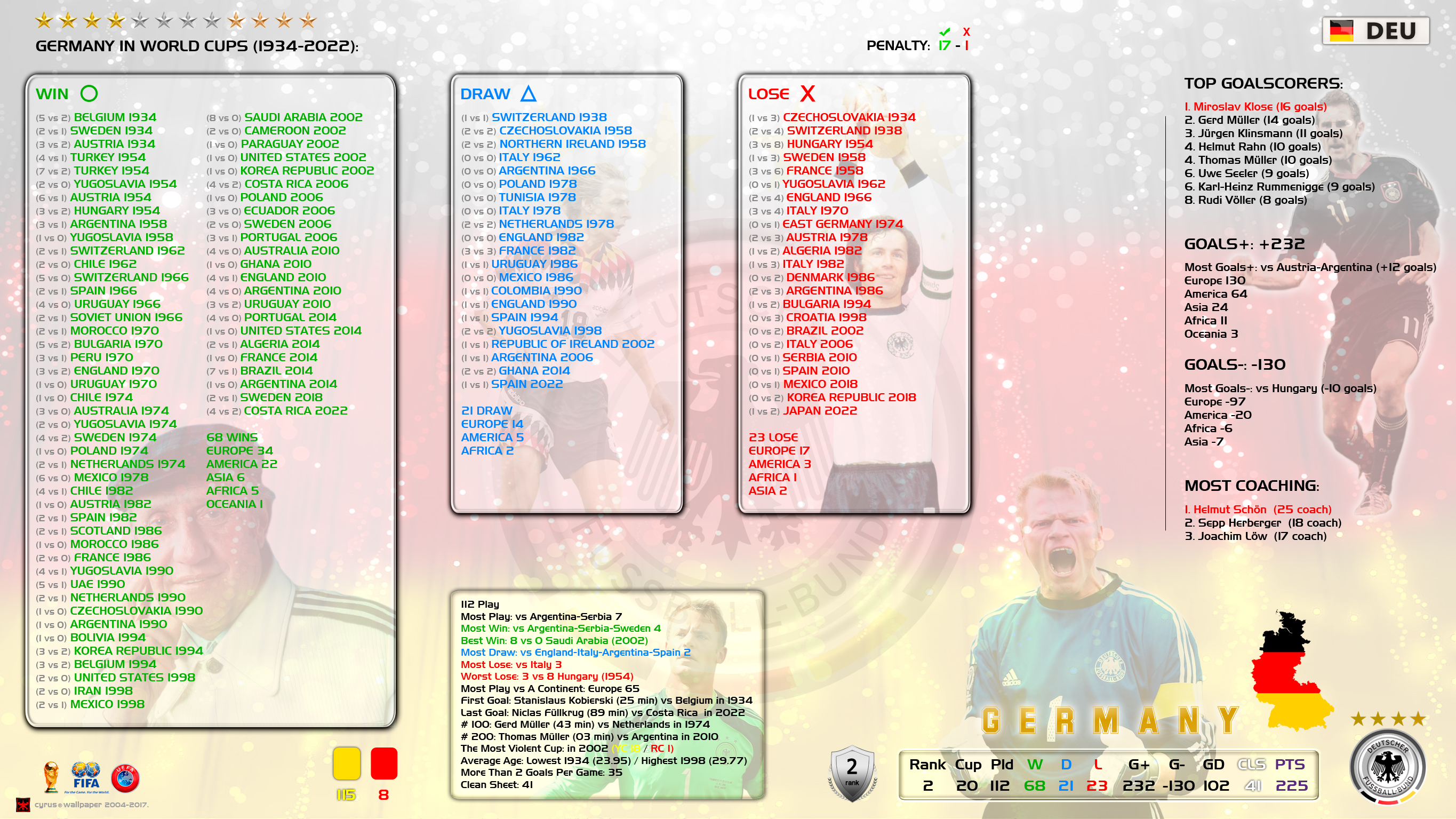 آلمان 2 بار در سالهای 1974 و 2006 میزبان جام جهانی بوده و 4 بار هم در سالهای 1954, 1974, 1990, 2014 قهرمان جهان شده است. آلمان از تیمهای پرطرفدار در کشور ما می باشد. این تیم با 13 حضور بیشترین تعداد حضور در نیمه نهایی جام جهانی را داراست و بعد از برزیل دارای رکورد بیشترین تعداد برد و گل زده در جام جهانی است. یکی از نقاط قوت آلمان نظم تیمی آن است که در گذشته به فوتبال ماشینی آلمان معروف بوده است. نقطه قوت دیگر آن هم این است که همیشه بهترین دربازه بان, بهترین مربی و بهترین مهاجمین تاریخ را در اختیار داشته. آلمان در جام های جهانی 1930, 1950 حضور نداشته است.