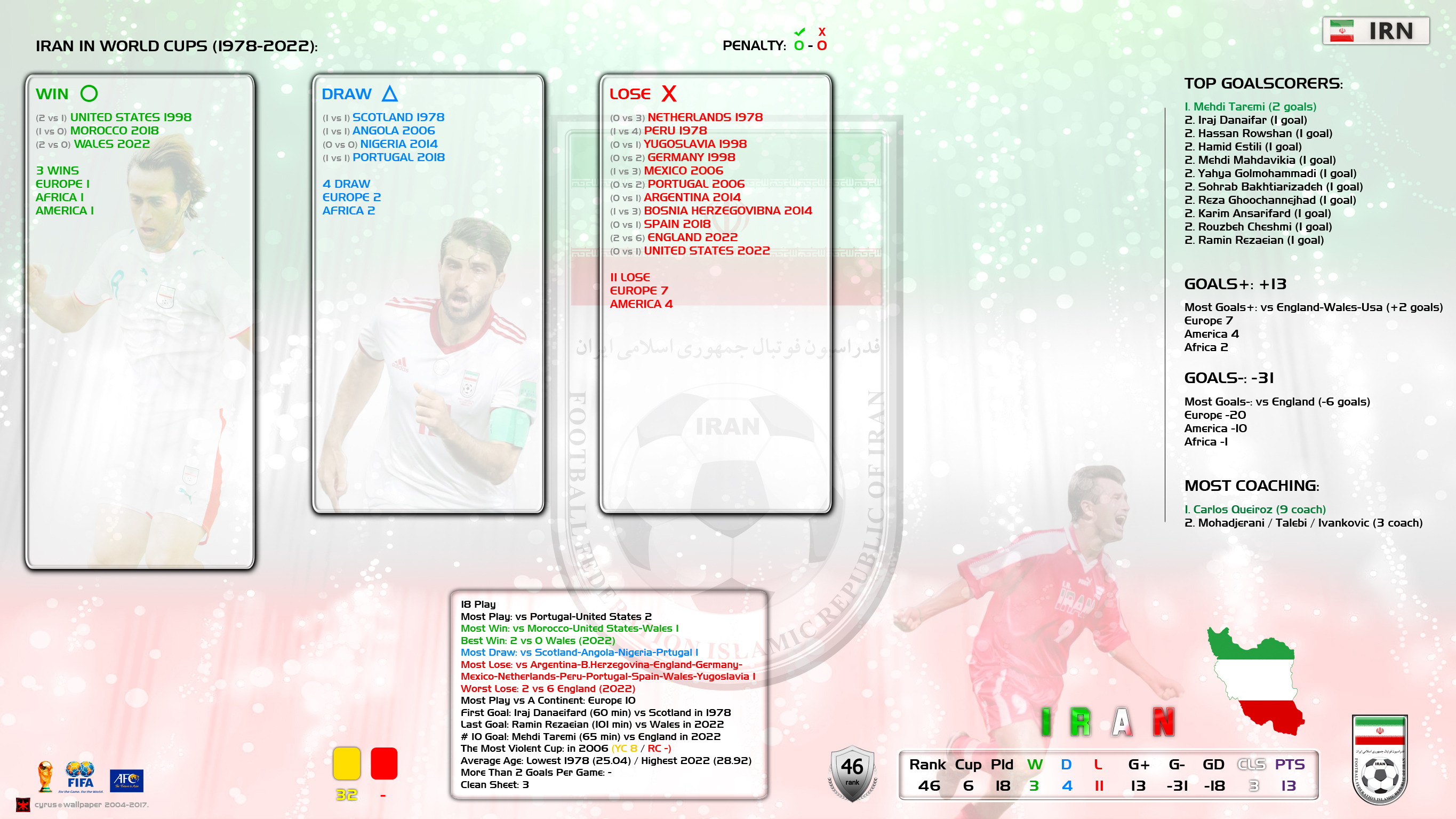 آمار ایران در جام جهانی از 1978 تا 2022. ایران تا به امروز 6 مرتبه توانسته در جام جهانی حضور یابد و هیچگاه موفق به صعود از مرحله گروهی نشده است