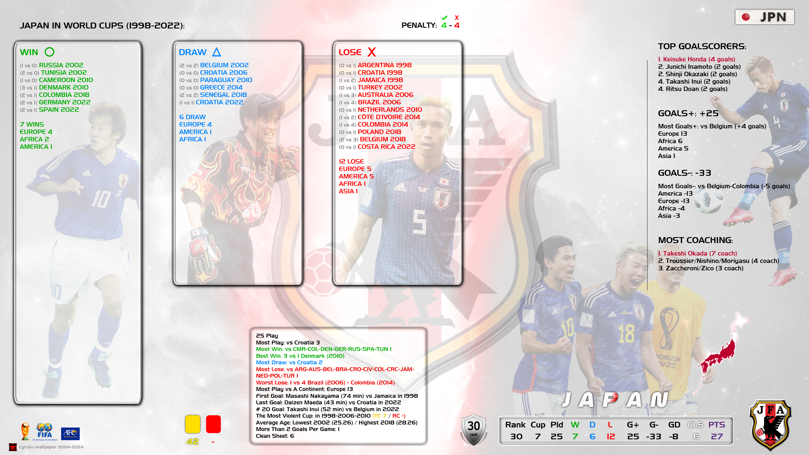 ژاپن از سال 1998 که نخستین حضورش در جام جهانی بوده همیشه در جام جهانی حضور داشته و هیچگاه موفق نشده از مرحله 1/8 بالاتر برود. فوتبال ژاپن از سال 1992 که برای نخستین بار قهرمان آسیا شدند متحول شد. آنها یک سال بعد تیم خوبی را, راهی مقدماتی جام جهانی 1994 آمریکا کردند اما در بازی مقابل عراق در واپسین لحضات بازی از رسیدن به جام جهانی باز ماندند. ژاپن در تاریخ 16 نوامبر 1997 با گل طلایی که "ماسایوکی اوکانو" به ایران زد برای نخستین بار جواز حضور در جام جهانی را دریافت کرد. ژاپنی ها به سرعت فوتبال خود را جلو می بردند. آنها در سال 1999 به صورت مشترک با کره جنوبی میزبانی جام جهانی را گرفتند و عملکرد خوبی هم از خود در سال 2002 نمایش دادند. در سال 2010 ژاپنی ها به مانند 2002 نمایش خیره کننده ای را از خود نشان دادند و با پیروزی 3 بر 1 مقابل دانمارک برای دومین بار وارد مرحله حذفی شدند و آنجا تنها در ضربات پنالتی مقابل پاراگوئه از جام کنار رفتند. ژاپن در 2018 و 2022 هم موفق به صعود از گروه خودش شد اما پیروزی که آنها در جام 2022 مقابل آلمان و اسپانیا بدست آوردند یک دست آورد بزرگ برای فوتبال آسیا به شمار می آمد. ژاپن در جام های جهانی 1930, 1934, 1938, 1950, 1954, 1958, 1962, 1966, 1970, 1974, 1978, 1982, 1986, 1990, 1994 حضور نداشته است.