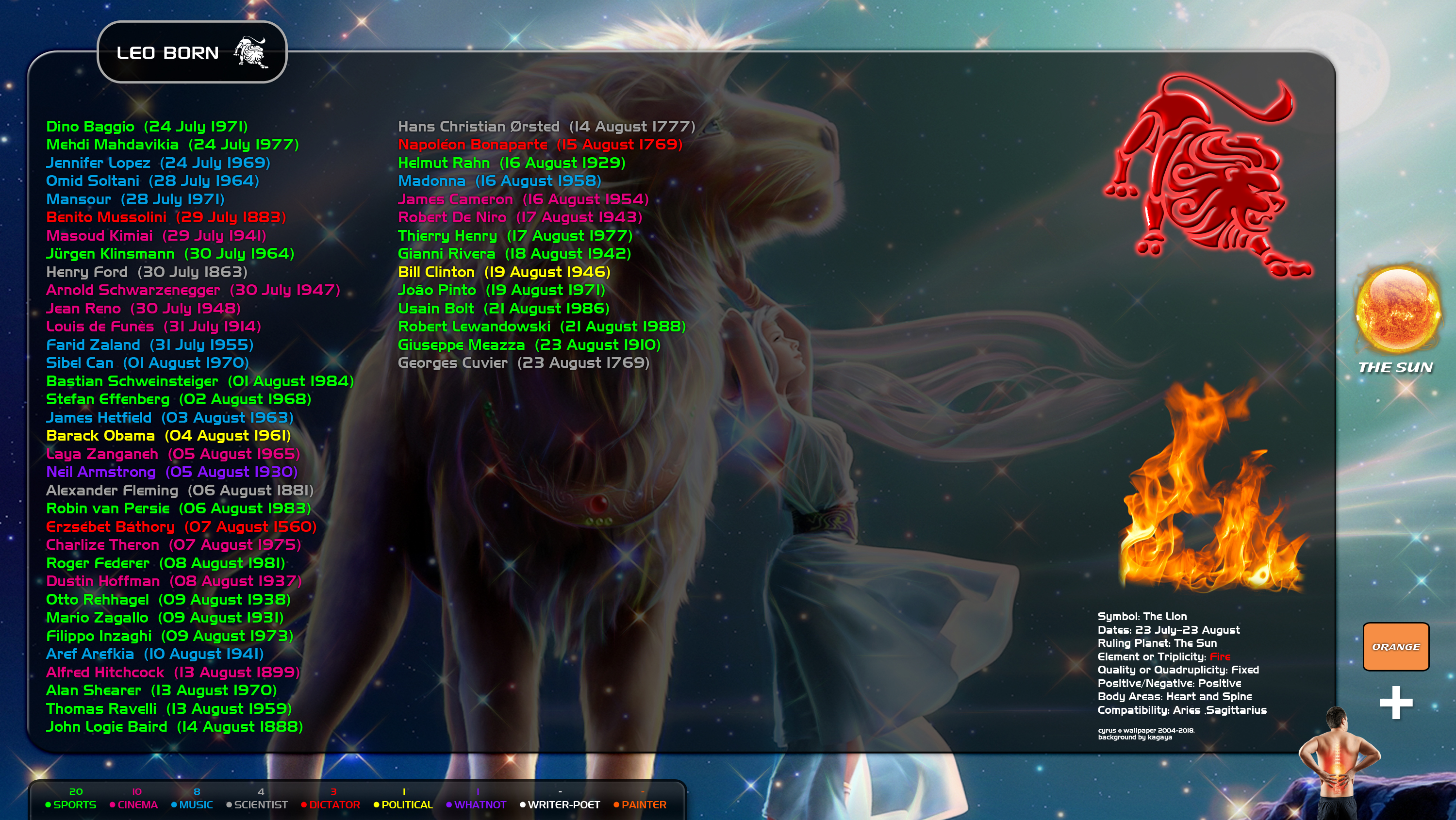 معرفی شخصیت های معروف و بزرگ جهان که متولد علامت فلکی Leo (اسد) هستند و نیز جهت پیدا کردن هم تولد خود. عنصر این ماه آتش, سیاره آن خورشید می باشد. اگر شما هم متولد Leo علامت هستید بهتر است با شخصیت های معروف و بزرگ جهان این ماه آشنا شوید. همینطور می توانید هم تولد خود را در این بین پیدا کنید. در این والپیپر تلاش شده تا از معروفترین شخصیت ها در زمینه خودشان استفاده شود. همچنین هر حرفه با یک رنگ مشخص شده تا کاربران راحت تر شخصت های ماه خود را پیدا کنند. از معروفترین شخصیت های متولد این ماه می توان از Alfred Hitchcock کارگردان معروف سینمای جهان, Madonna خواننده مشهور آمریکایی و Napoleon Bonaparte یکی از بزرگترین دیکتاتورهای تاریخ نام برد.
