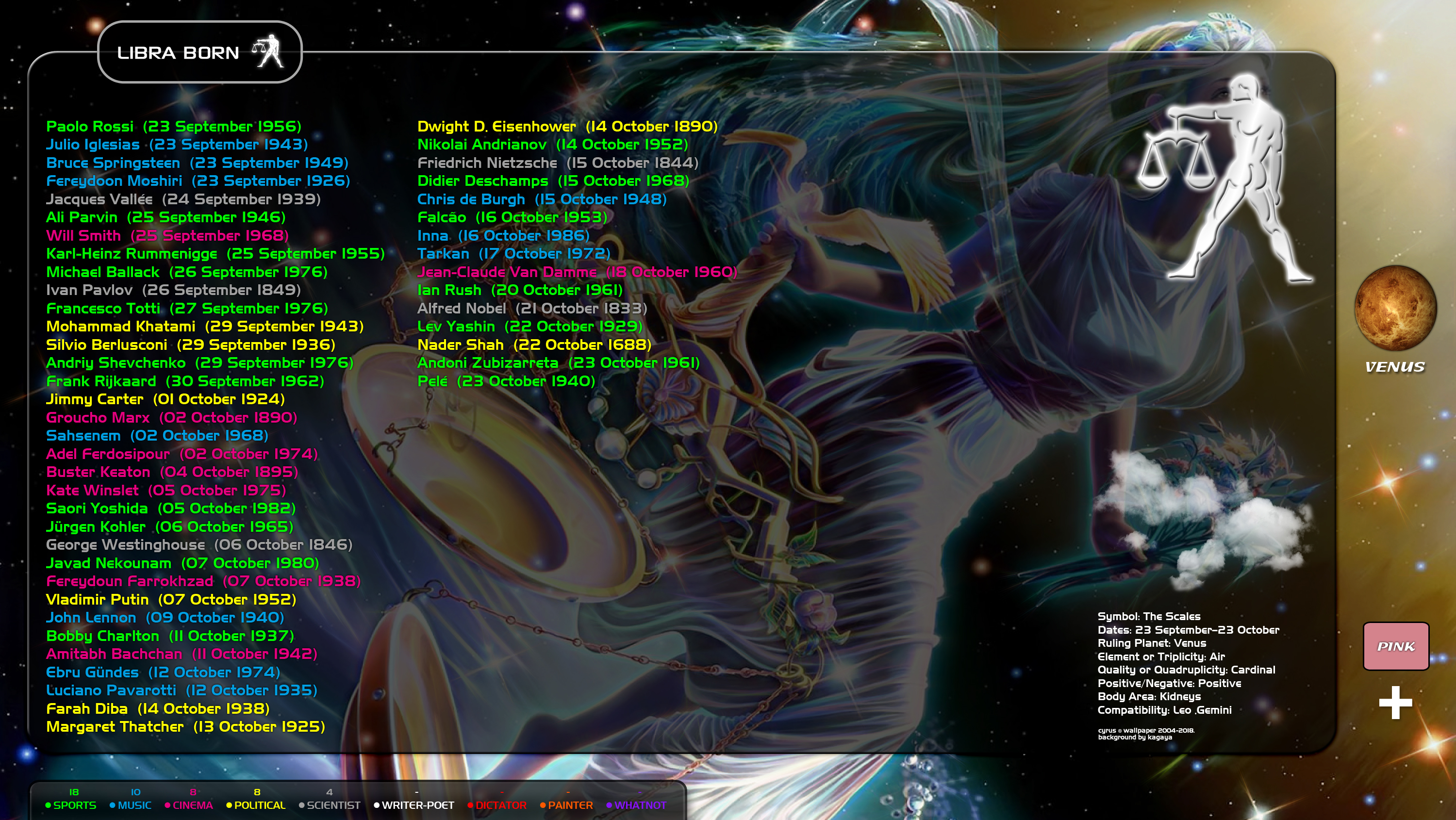 معرفی شخصیت های معروف جهان که متولد علامت فلکی Libra (میزان) هستند و نیز جهت پیدا کردن هم تولد خود. عنصر این ماه هوا , سیاره آن ونوس می باشد. اگر شما هم متولد Libra هستید بهتر است با شخصیت های معروف و بزرگ جهان این ماه آشنا شوید. همینطور می توانید هم تولد خود را در این بین پیدا کنید. در این والپیپر تلاش شده تا از معروفترین شخصیت ها در زمینه خودشان استفاده شود. همچنین هر حرفه با یک رنگ مشخص شده تا کاربران راحت تر شخصت های ماه خود را پیدا کنند. از معروفترین شخصیت های متولد این ماه می توان به Ali Parvin سلطان فوتبال ایران, Chris de Burgh خواننده مشهور آرژانتینی و Farah Diba ملکه ایران اشاره کرد.