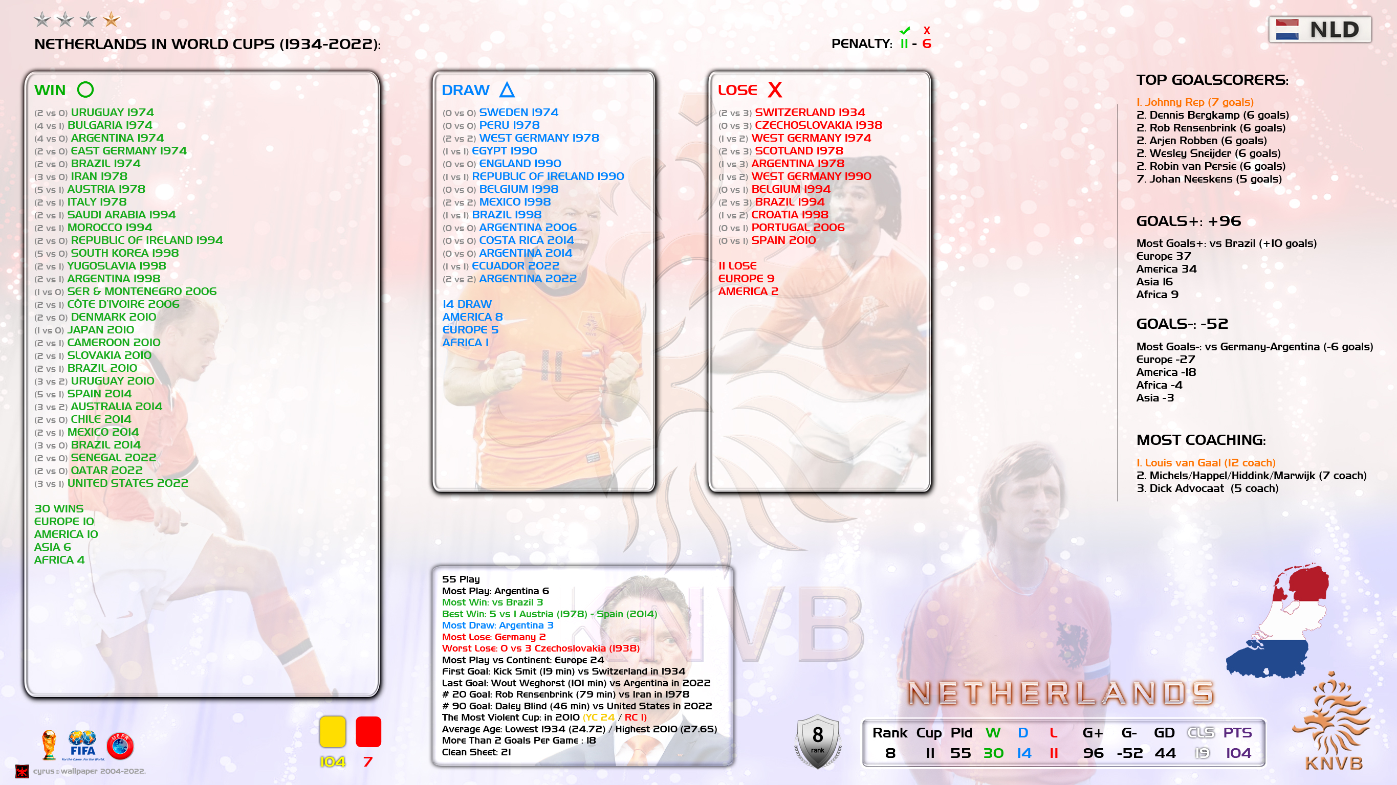 هلند 3 بار نایب قهرمان جام جهانی شده است و هیچگاه میزبان مسابقات نبوده. از هلند می توان به عنوان بدشانس ترین تیم جام های جهانی یاد کرد. تیمی که همیشه کیفیت خوبی از خود در مسابقات به نمایش می گذارد ولی هیچگاه نتوانسته قهرمان جهان شود. آنها حتی در مسابقات یورو هم تنها یکبار در سال 1988 قهرمان شده اند. فوتبال شناوری که هلند در دهه 70 از خود به نمایش گذاشت فوتبال جهان را به یکباره متحول کرد. فوتبالی که بر پایه مکتب باشگاه بازیکن ساز آژاکس بنا شده بود. هلند در جام های جهانی 1930, 1950, 1954, 1958, 1962, 1966, 1970, 1982, 1986, 2002, 2018 در حضور نداشته است.