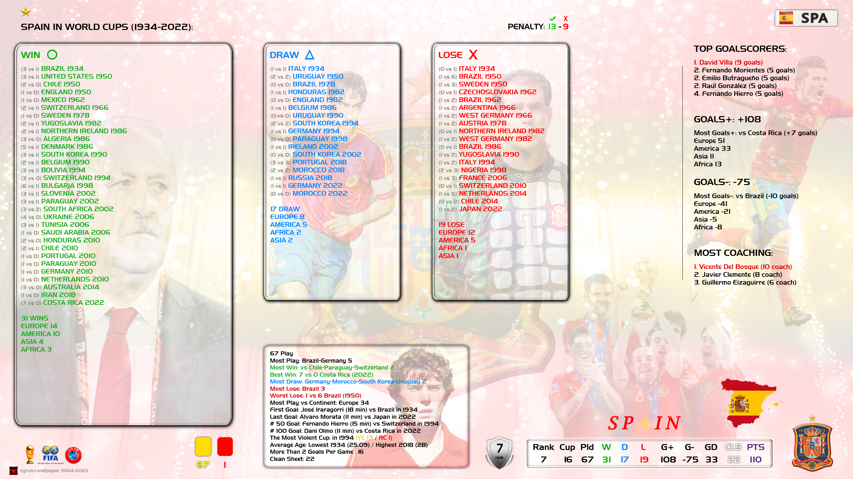 اسپانیا یک بار در سال 1982 میزبانی جام جهانی را به عهده گرفت و یکبار هم در سال 2010 عنوان قهرمانی را کسب کرده. اسپانیا از دهه 50 میلادی با جذب بازیکنان بزرگ فوتبال به مانند فرانس پوشکاش, دی استفانو سعی در بالا بردن کیفیت لیگ خود کرد و افتخارات بسیاری را هم در این عرصه کسب نمود و یک بار هم در سال 1964 قهرمان مسابقات یورو شد. اما تیم اسپانیا از سال 2008 به بعد در عرصه ملی درخشید. اسپانیا به دلیل اینکه همیشه سعی در جذب ستاره گان دنیای فوتبال در لیگ خود دارد طرفداران بسیار زیادی چه در ایران و چه کشورهای دیگر دارد. اسپانیا در جام های جهانی 1930, 1938, 1954, 1958, 1970, 1974 حضور نداشته است ولی از سال 1978 به بعد همیشه یک پای ثابت جام جهانی بوده است.